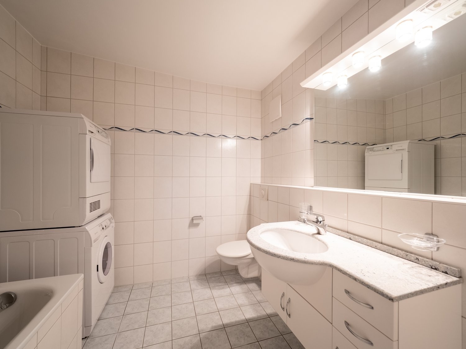 Il est également composé de trois chambres à coucher, d'une salle de bain avec colonne de lavage (lave-linge et sèche-linge) ainsi que d'un WC/douche séparé.