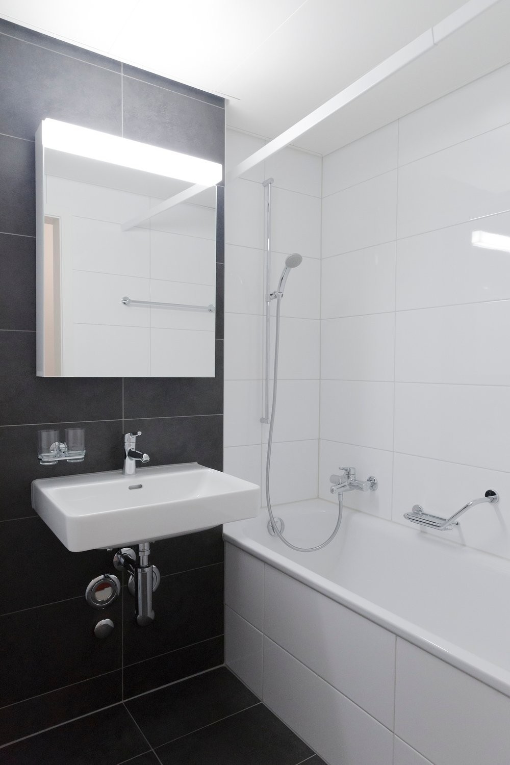 Salle de bains munie d'une baignoire et d'une colonne de lavage ainsi que d'un WC séparé.